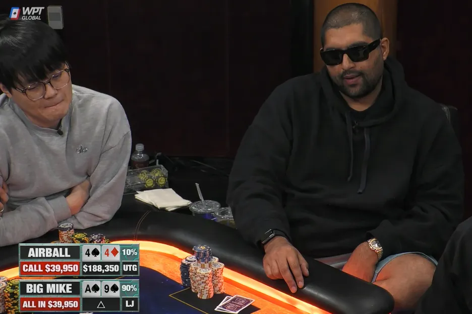 Big Mike moved all-in for $39,950 with his two pair, and Ye folded pretty quickly – but Airball wasn’t done, going into the tank before making the call.