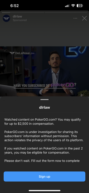 A Florida law firm specializing in class-action claims has taken to social media in recent days with an 'attorney advertisement' alleging that PokerGO has shared subscriber information without permission and has violated its customers' rights. The ad — as it appears on Twitter/X — was placed by De la Rosa Law and has been targeted toward users with a demonstrated search interest in poker.