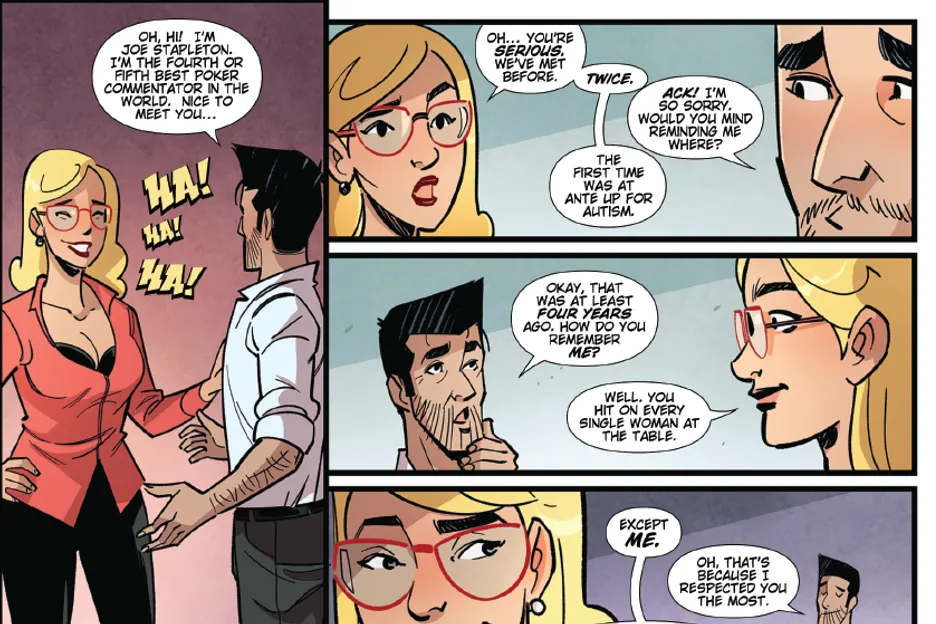 While the world the story builds may be forgivably cartoon-like, with Stapes providing ‘poker consultancy’ authenticity is the watchword when it comes to the game of poker itself.