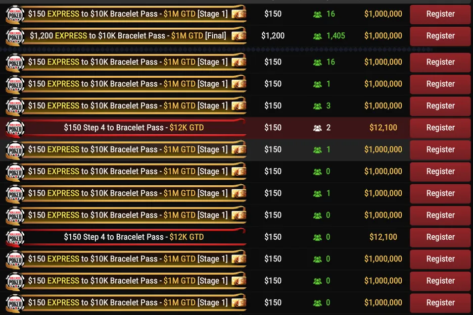 Step 4 to Bracelet Pass tournaments run daily, with one $10K Bracelet Pass guaranteed plus Step 4 tickets for the runners-up. You’ll start with a 10K stack and blinds of 50/100, with 8 minute levels.