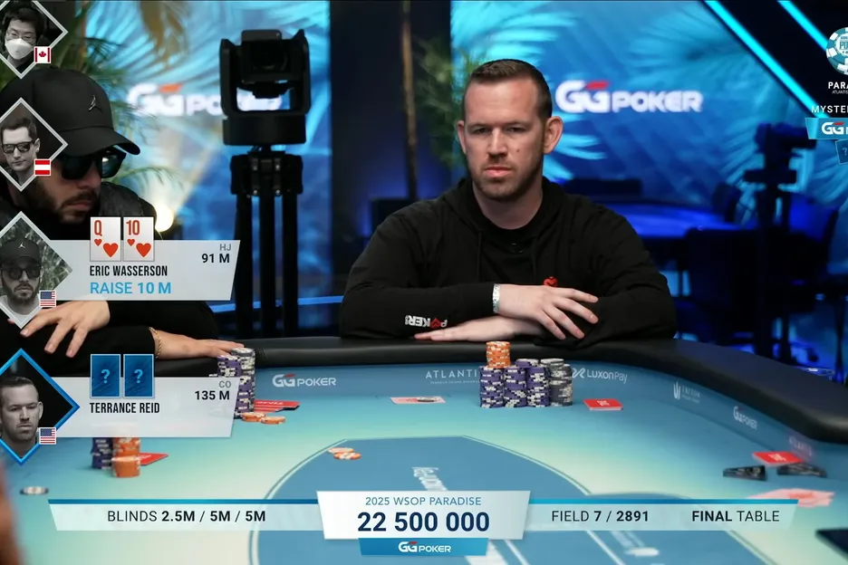 This hand occurred during the 2025 WSOP Paradise Super Main Event in The Bahamas between PokerOrg’s very own Terrance ’TJ’ Reid and Eric Wasserson.