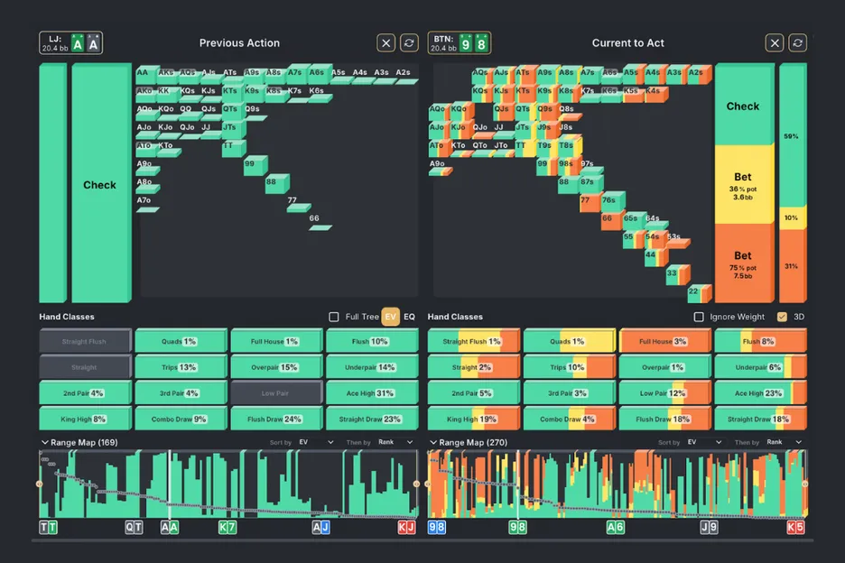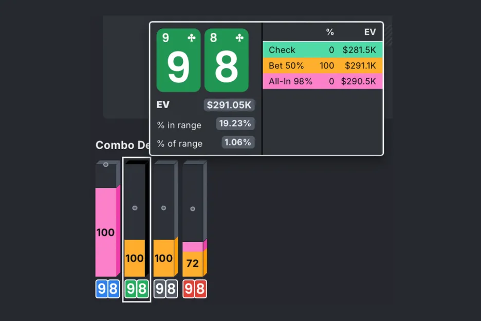 As we can see, full houses want to pile the money pure, along with our worst holdings like A9o/K5s/54s, etc. The remaining strong holdings — flushes, straights, trips — mix big bets or checks, protecting the checking range and controlling the pot. Joao’s specific hand, , mixes all options, including small bets that push the equity up a bit without inflating the pot too much. He chooses to take that route and make a small bet for 36% of the pot.