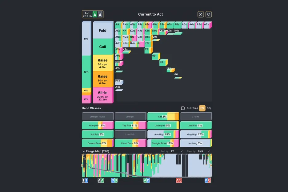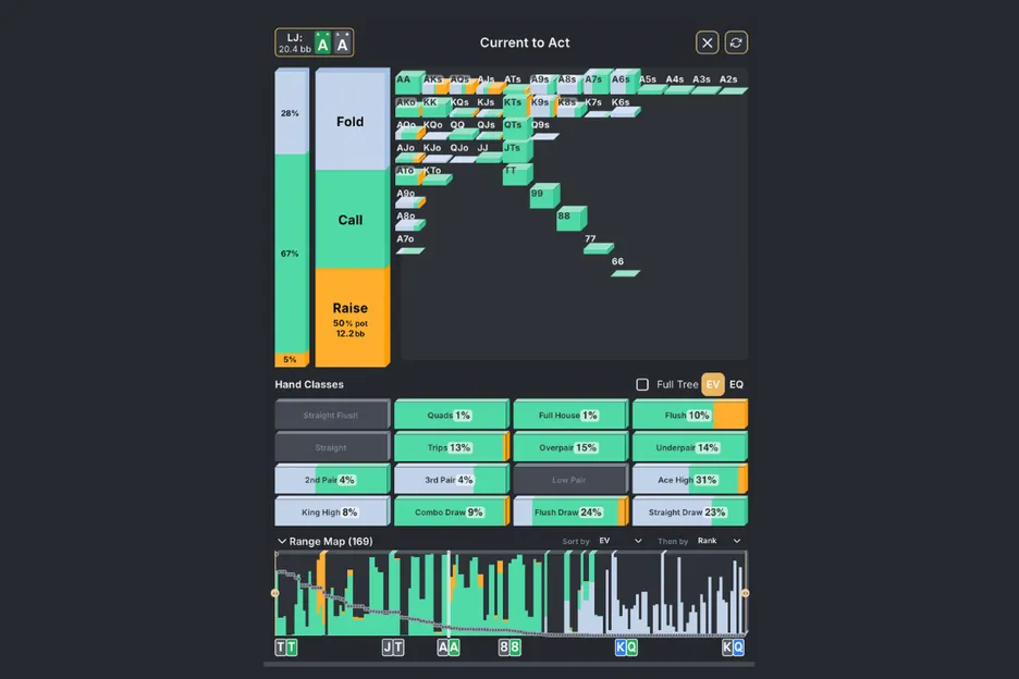 Interestingly, the solver now would have agreed with Joao’s decision to check back the river — despite the much lower SPR. Fedor’s range is significantly stronger now, having withstood a bigger turn bet all the while carrying a significant risk premium for busting. Against that range, all straights are now checking behind pure. Facing the river jam, AA is folding outright.