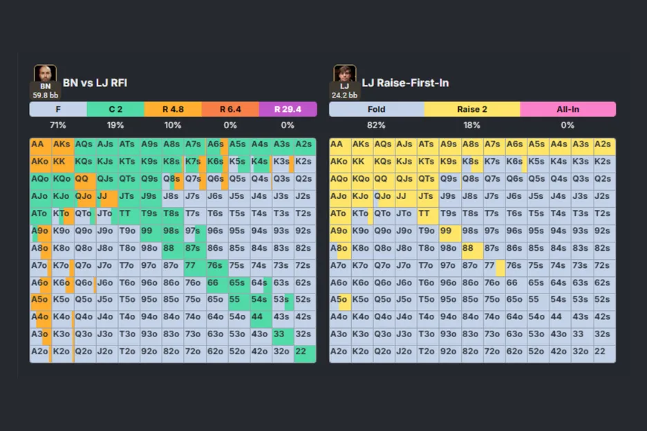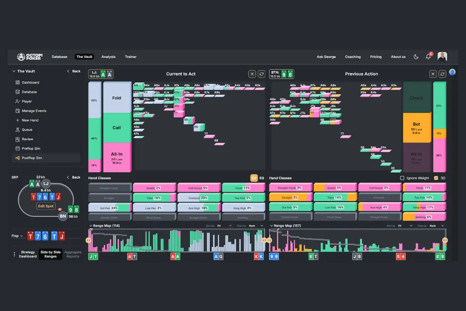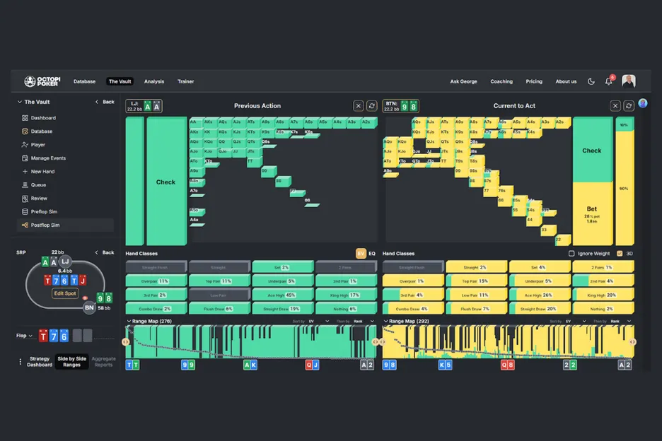 Using Octopi’s Side-by-Side Range Explorer, we can see the flop strategies for both players: