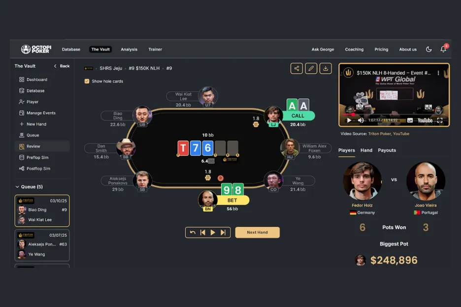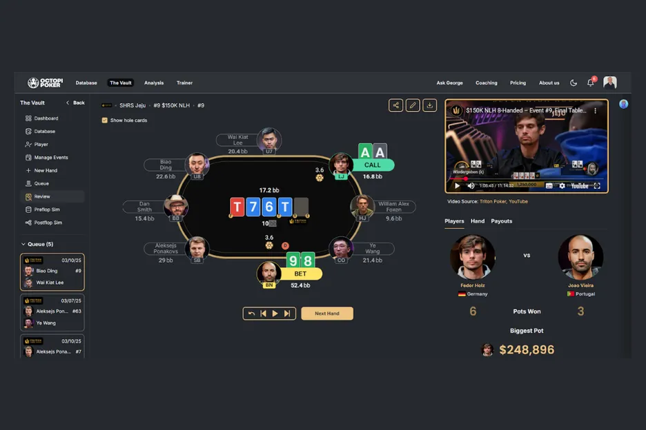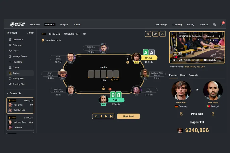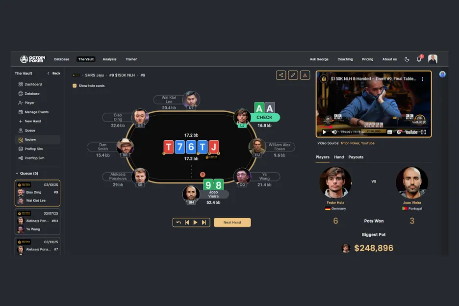 Today we examine the 2nd key hand from Joao Vieira's victorious run, this time against Fedor Holz holding the best hand in poker, pocket aces, and ready for battle! This hand, along with sims, can be found at Octopi Poker Vault (subscription is required).