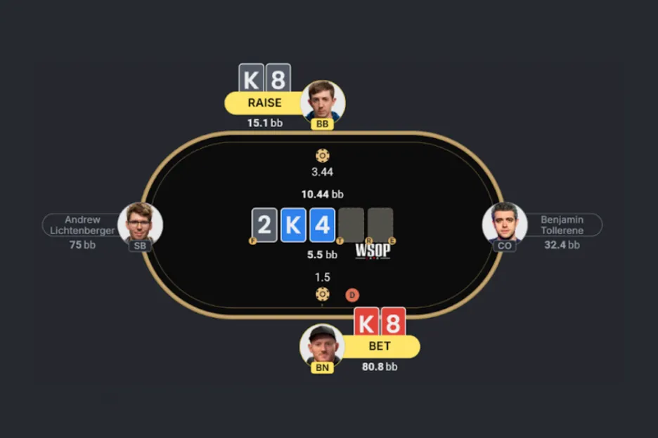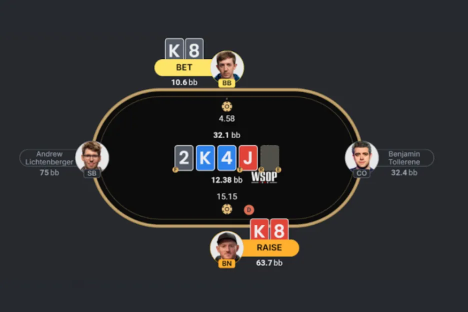 K8 is so high in BB range that it must continue barreling and be willing to stack off, splitting the aggression between a non-all-in bet, setting up a half-pot river jam and an outright jam. Brock chooses to bet non-all-In for 37% of the pot.