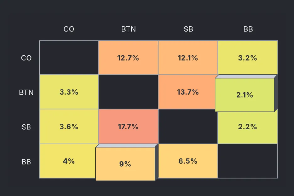 However, if SB were to double through BTN, reaching 150bb and crushing the chip leader down to 9.7bb, it would also be an ICM disaster, so the risk premium in the opposite direction is the second highest, at 13.7%. In the close 3rd, both BTN and SB can pressure the middle stack of CO to the tune of 12%.