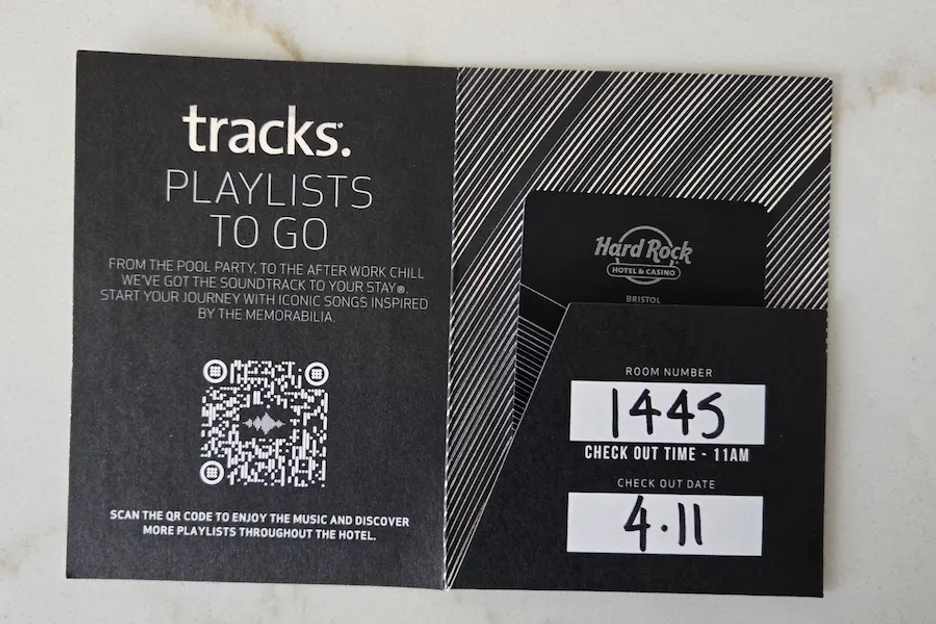 Look at the room number, followed by the check-out date. Here I am at a Hard Rock hotel, in the town that is the birthplace of country music. And they've even taught me the chords to Louie Louie right on my key card envelope.